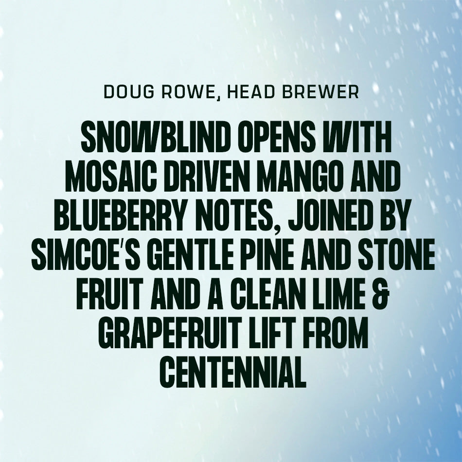 In your gloved-hand is every professional snowball thrower’s favourite beer, a hazy IPA that’s as fresh and soft as the white stuff below their feet. Hopped with Mosaic, Simcoe and Centennial, the flavours of mango, blueberry, stone fruit and pine are underpinned by a pillowy body, low bitterness and a subtle malt sweetness.